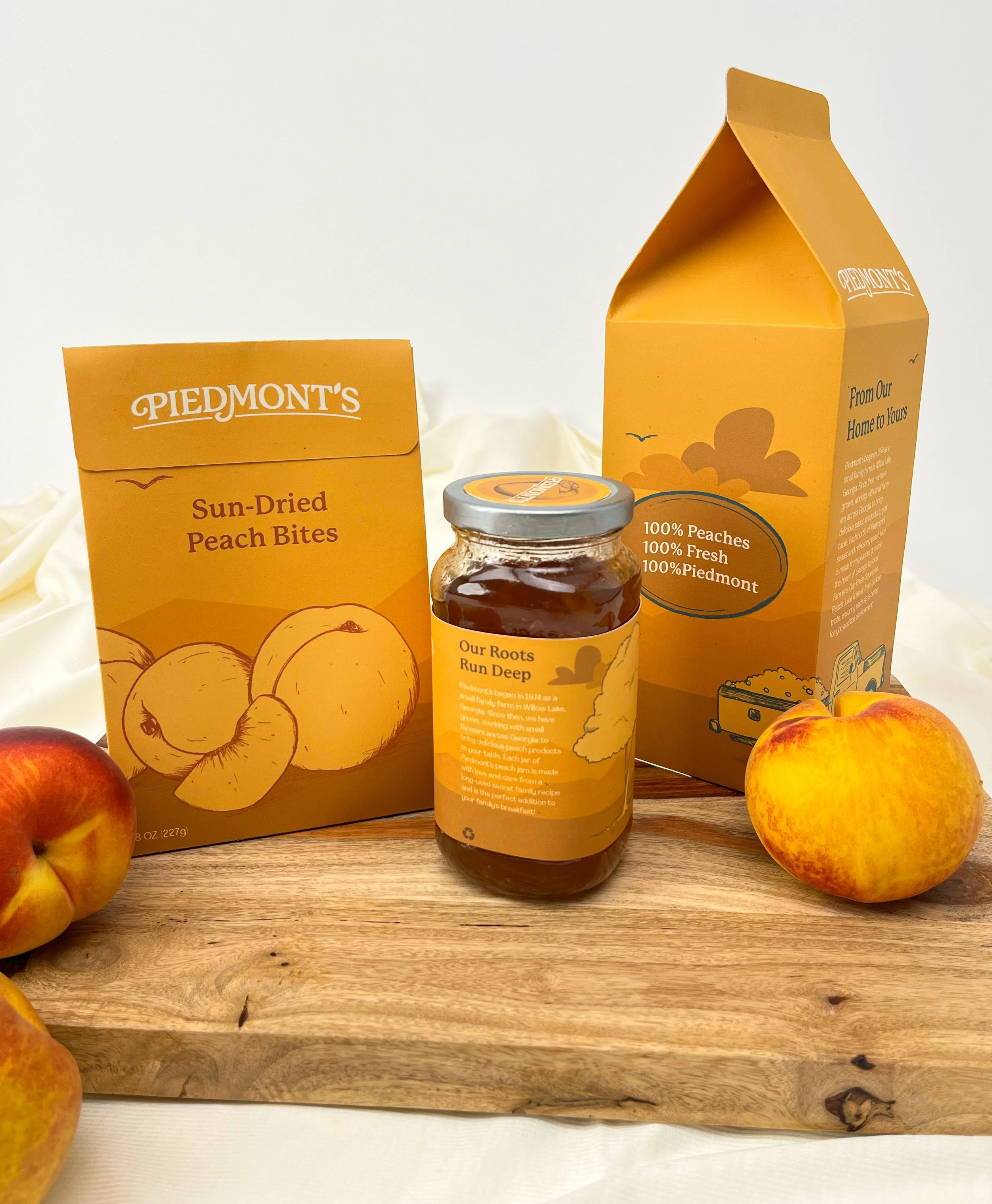 Piedmont’s Peaches is a fictional brand, inspired by a family-owned peach farm founded in rural Georgia in 1974. The concept imagines the farm’s next chapter—partnering with small growers across the Southeast and expanding beyond farmers markets into regional grocery stores.